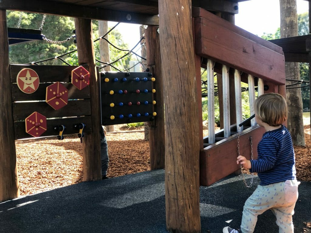 The play equipment is really impressive, a lot of it made out of wood, including a huge seesaw and two seperate forts. There are many rope ladders/nets/webs to climb up/down/across and even a net cage where I thoroughly enjoyed capturing my three year old for a short while! Double slide, nest swing, stepping stones, wooden balancing stumps, water pump, tennis courts - there is so much to do. Plus, you could even squeeze in a sneaky workout on the adult gym equipment right next to the playground or just lounge around on the huge grassed area instead whilst your little ones kicked a ball around.